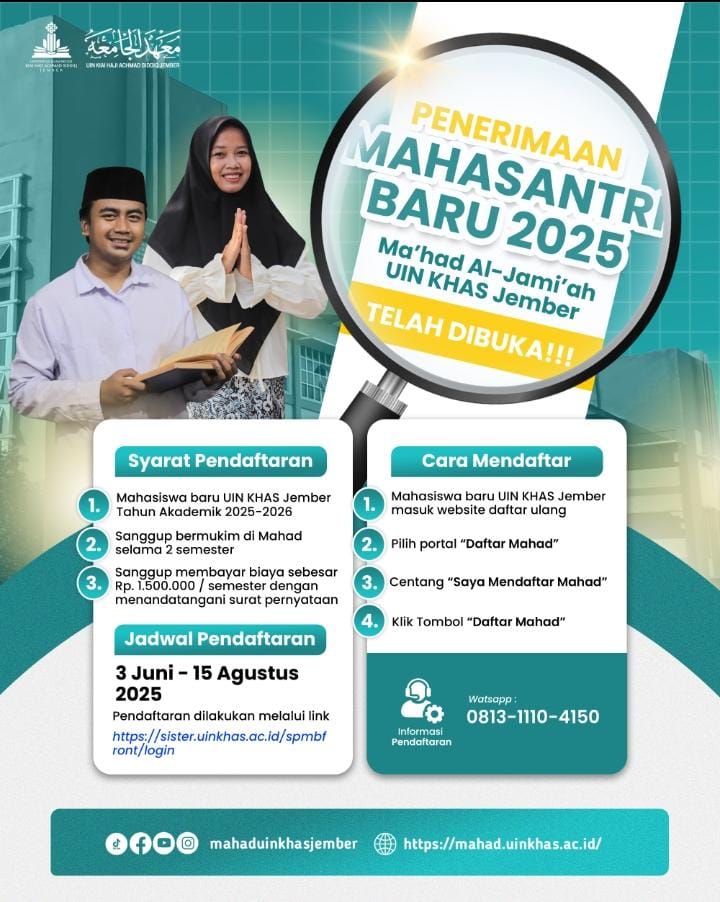 Telah dibuka pendaftaran Santri Baru Ma'had Al-Jami'ah UIN KHAS Jember Tahun 2025-2026.